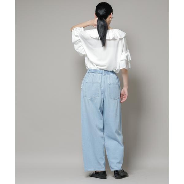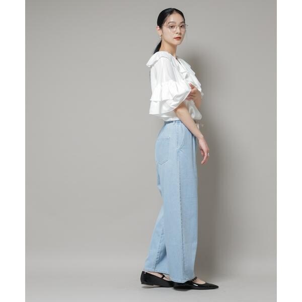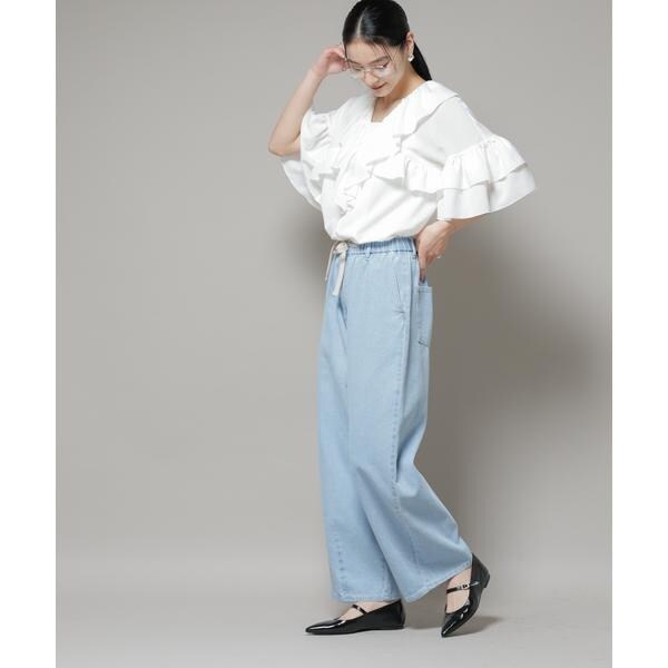 胸元にたっぷり施されたピコフリルが目を引くブラウス。ボリューム感のあるアイテムなので、裾はボトムにインしてウエスト回りをすっきりさせて、バランス良く合わせる着こなしがおすすめです。