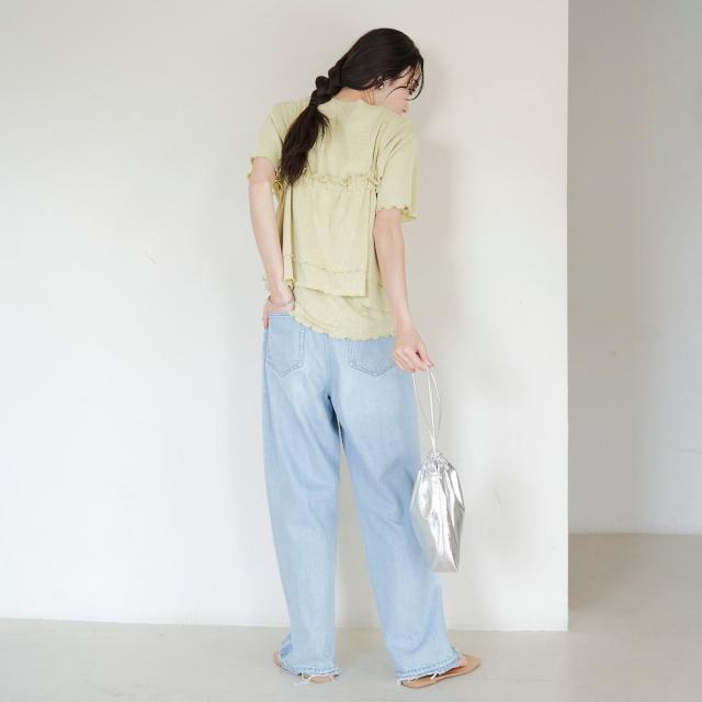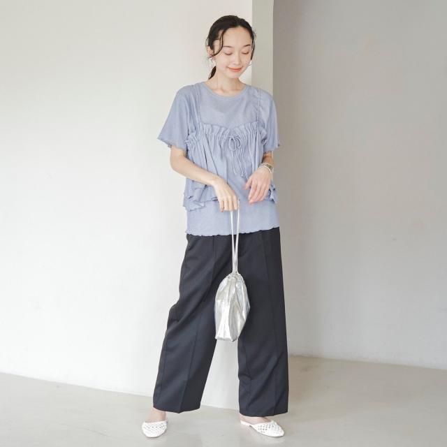 シンプルなTシャツに、フリルキャミを重ねて甘さをプラスすれば、カジュアルながらもフェミニンな着こなしに。