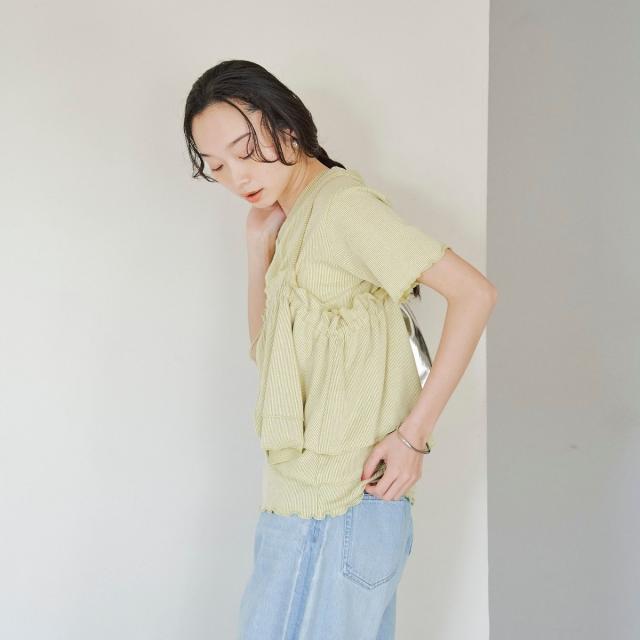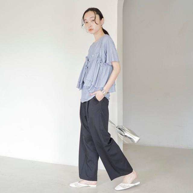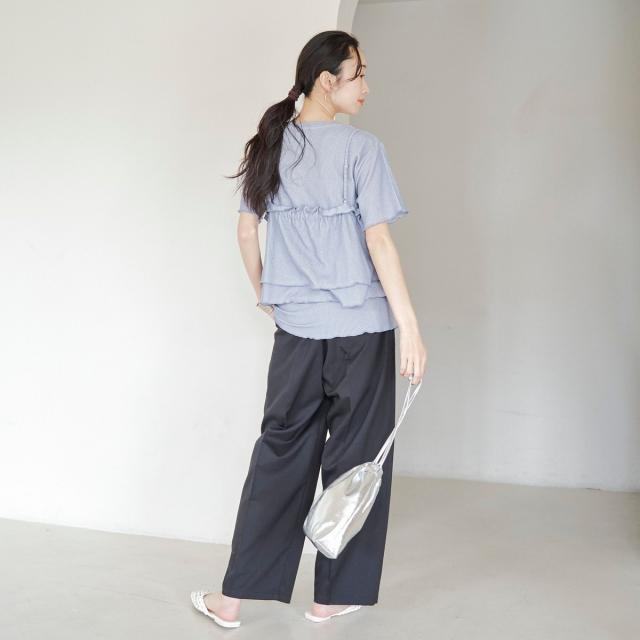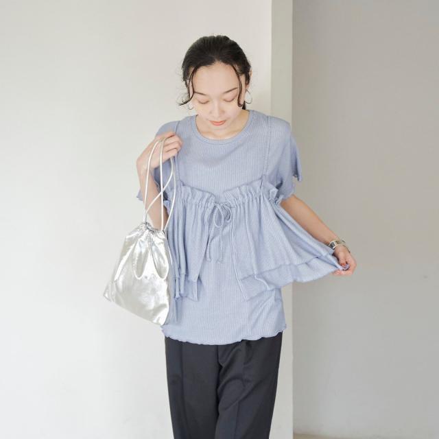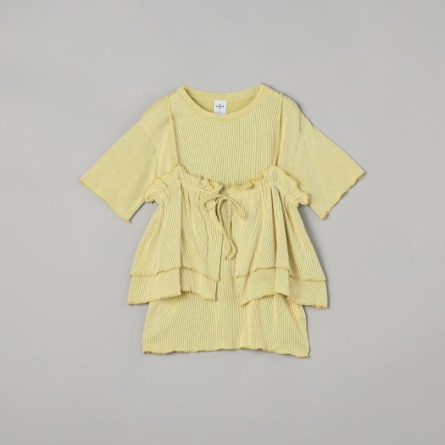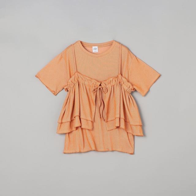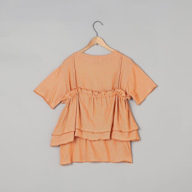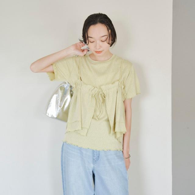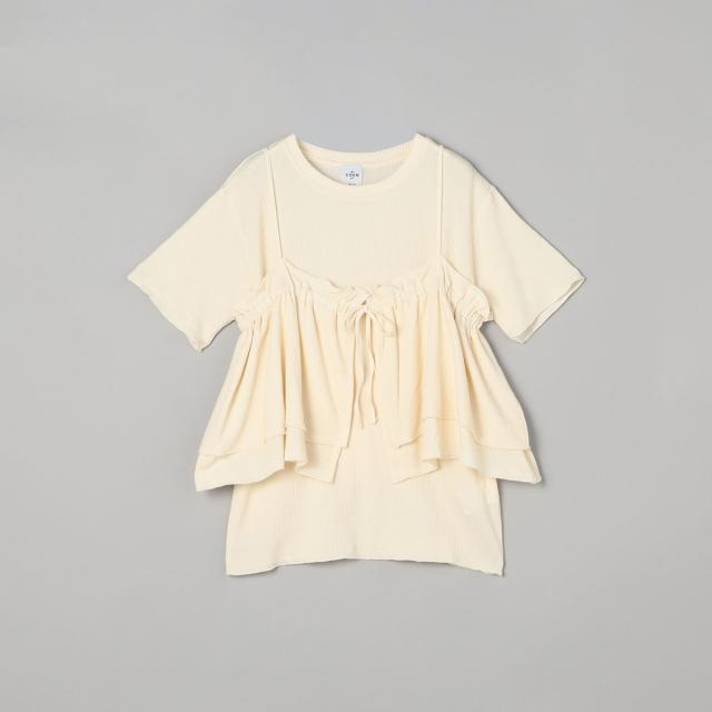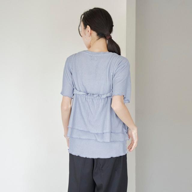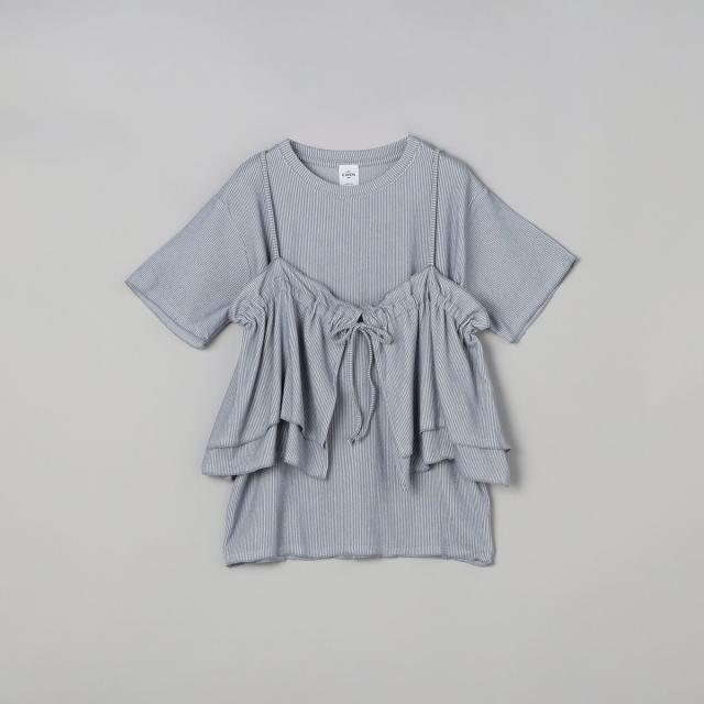 やわらかく伸びの良い細リブカットソーを使用したベーシックなTシャツと、前後2WAYで使えるフリルキャミソールのセットアイテム。