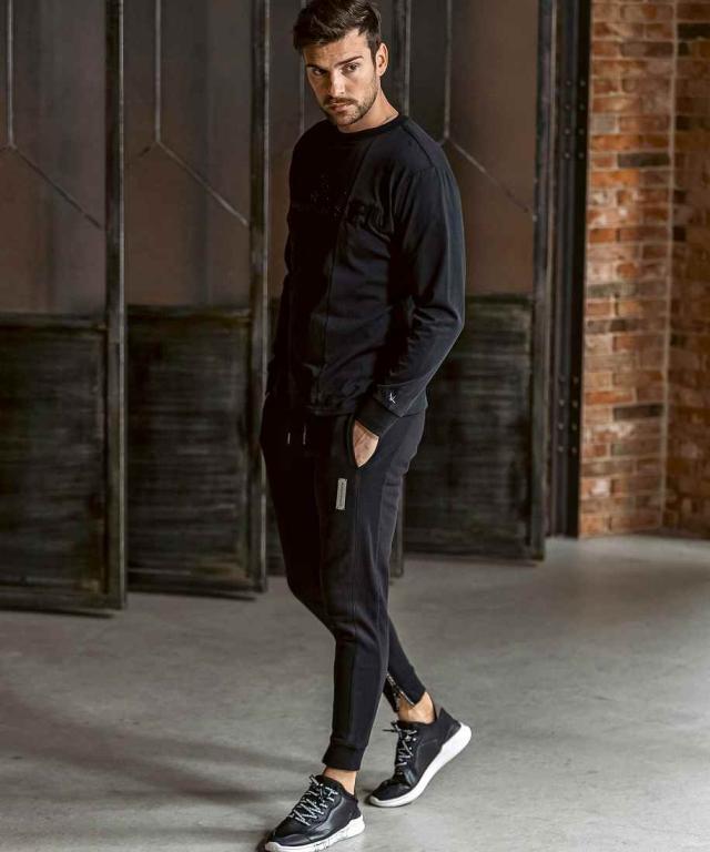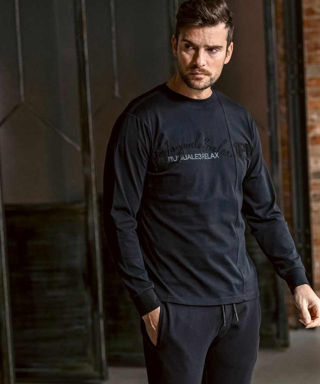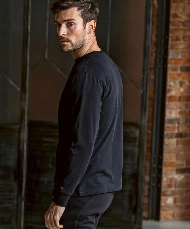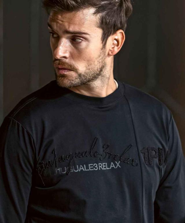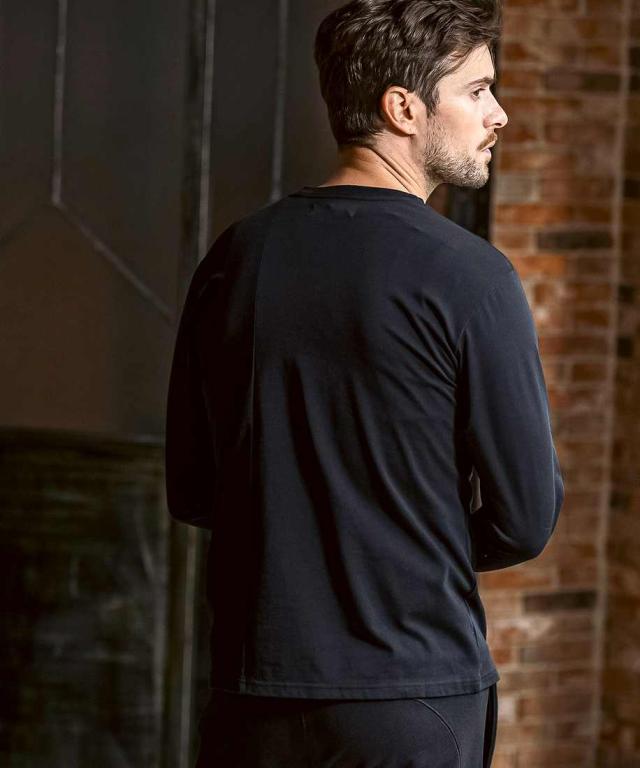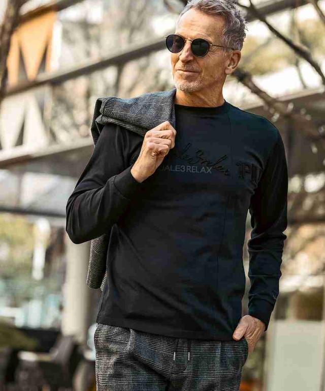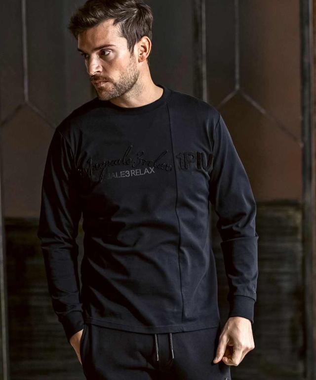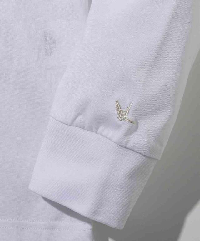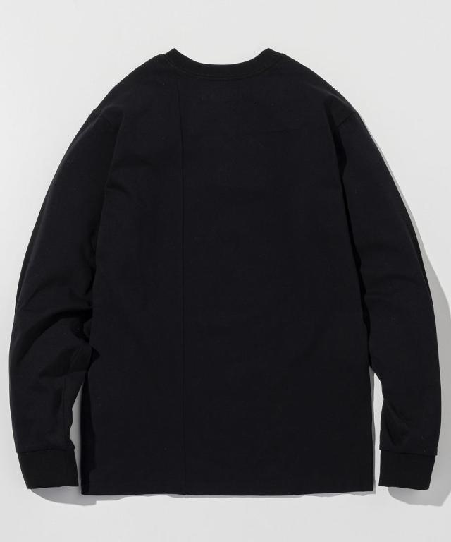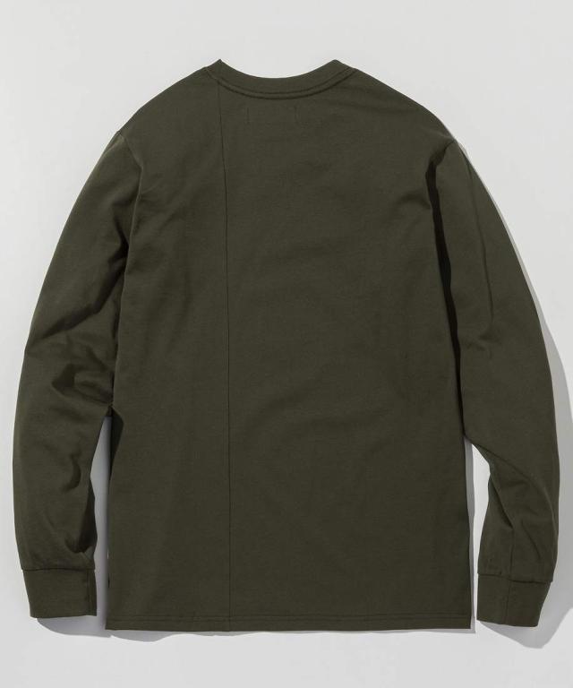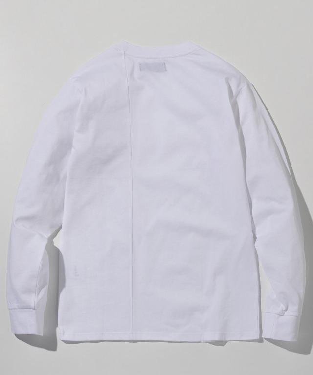 左右で異なる加工のロゴを配置したスウィッチングデザインの長袖カットソー。