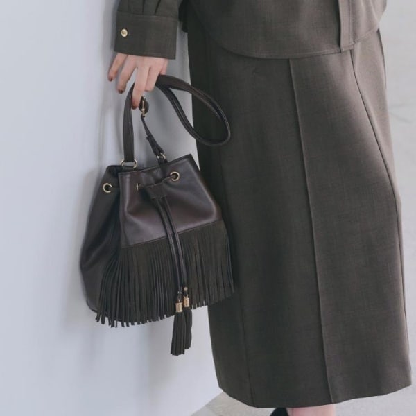 今年注目のスエード素材のフリンジ巾着ショルダー。