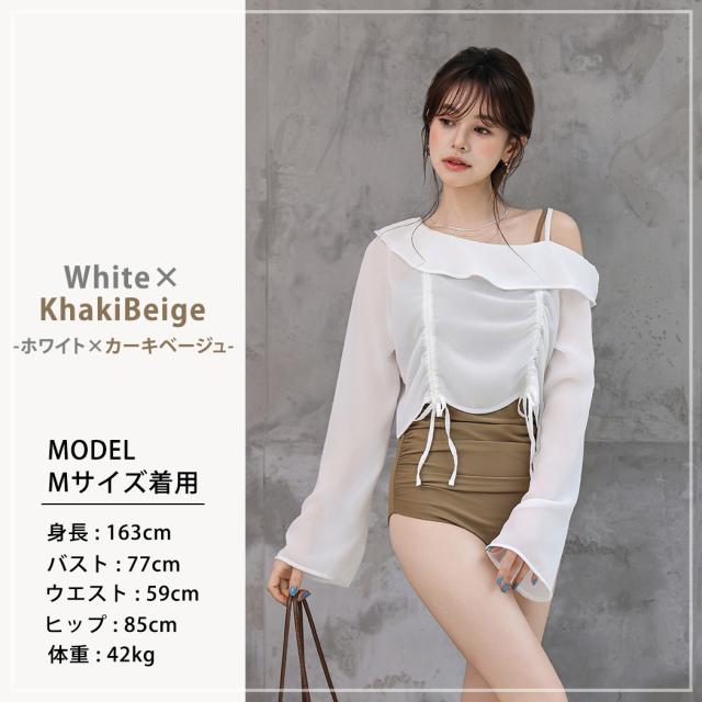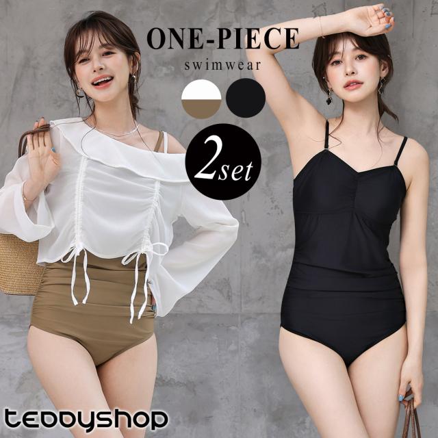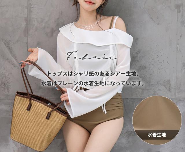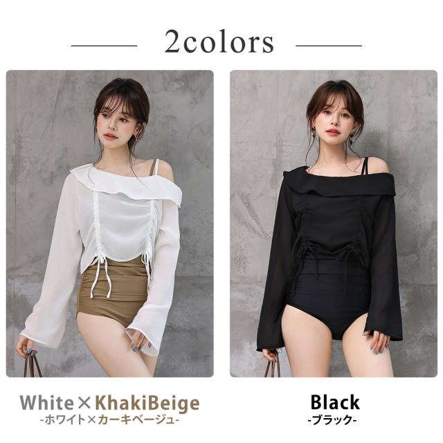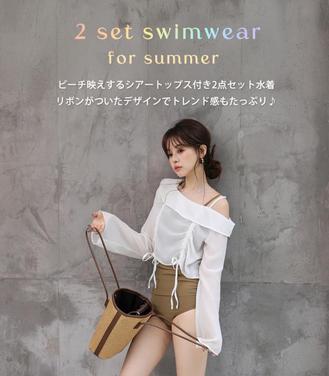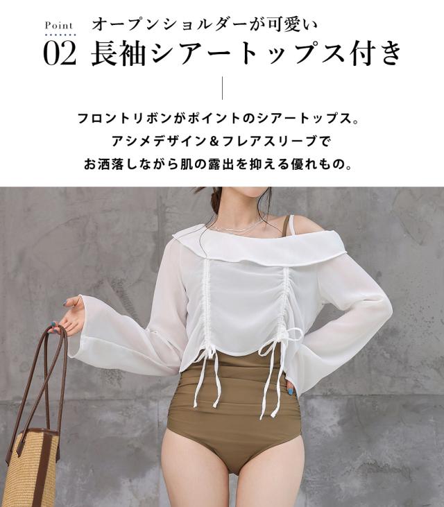 夏新作 オールインワン 水着 レディース 袖あり ビーチ映え シアー トップス 2点 セット リボン デザイン トレンド 長袖 楽ちん シンプル 体型 カバー ギャザー 胸元 ウエスト サイド メリハリ パッド付き 入れ替え可能 白 黒 旅行 夏 海 プール リゾート