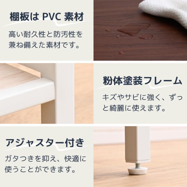 ・フレーム:鉄 ・天板・棚板:合成樹脂化粧繊維板(PVC) ・引出し:不織布 |