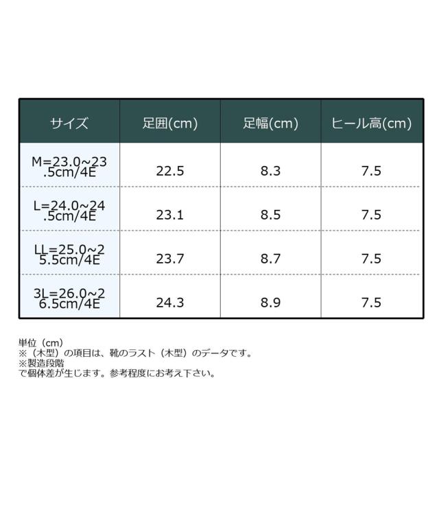 材質=合成皮革、合成繊維 底材=合成底 ヒール=約7.5cm ワイズ=4E 原産国:中国製 備考:単位(cm) ※(木型)の項目は、靴のラスト(木型)のデータです。 ※製造段階で個体差が生じます。参考程度にお考え下さい。