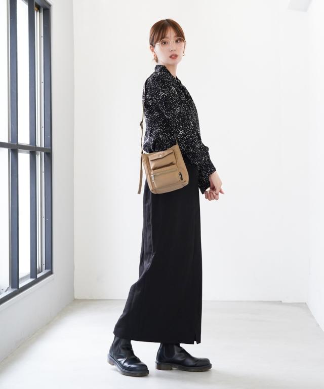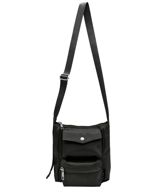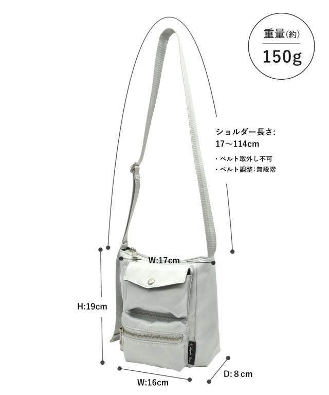 材質=ポリエステル サイズ=たて約19×よこ(上部)約17(底部)約16×まち幅約8cm 開閉=ファスナー ポケット=外:3個(オープン1、ファスナー1、マグホック1) 肩ひも長さ=約17〜114cm 調整可 取り外し不可 重量=約150g 原産国:中国製