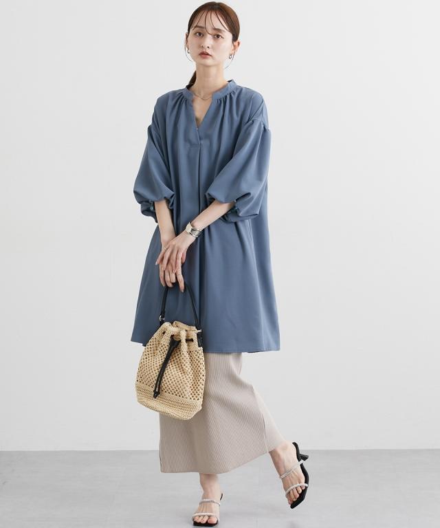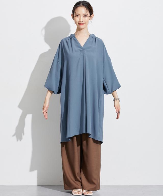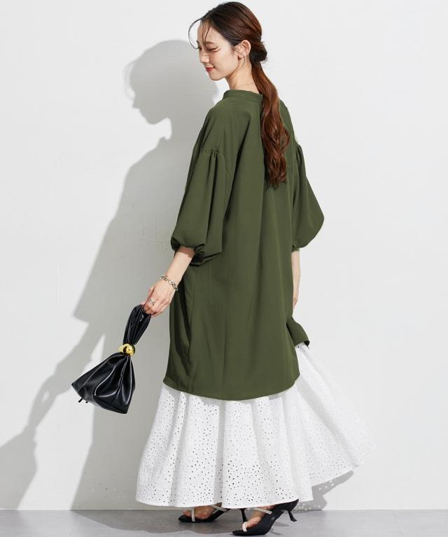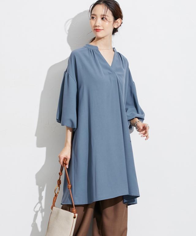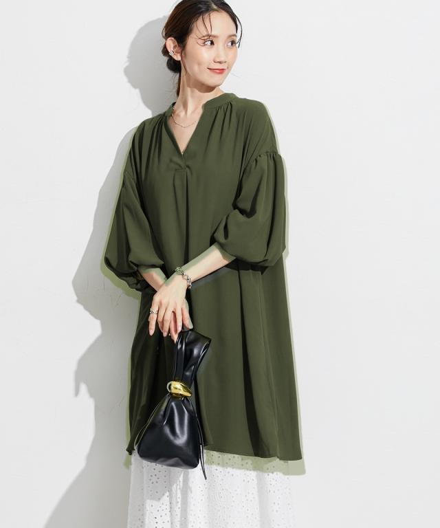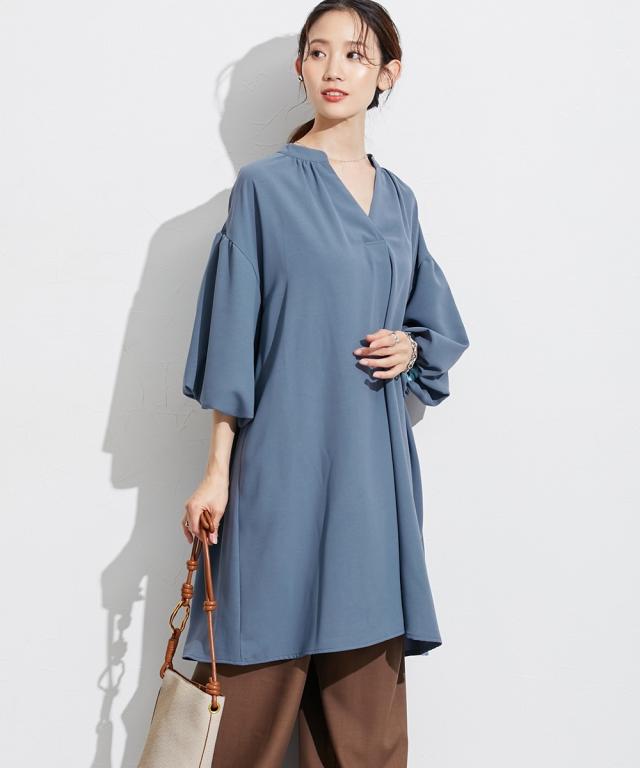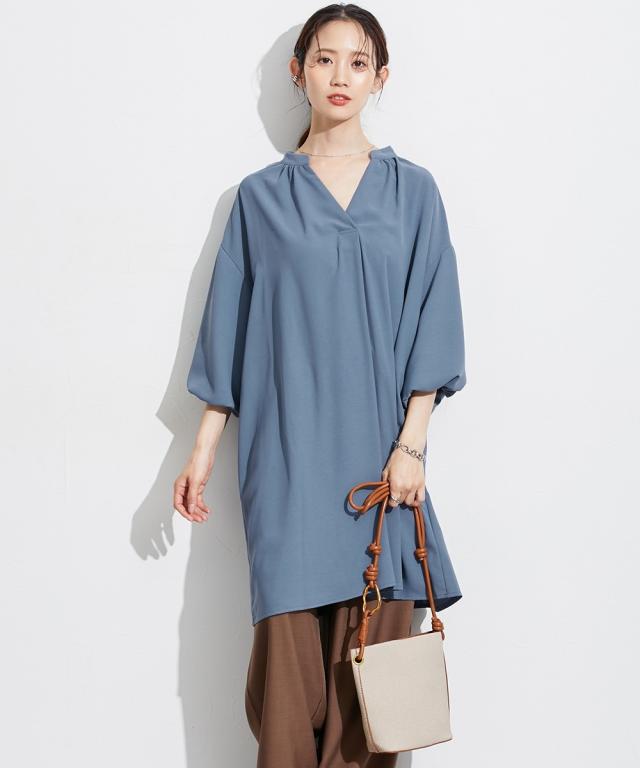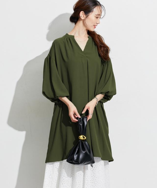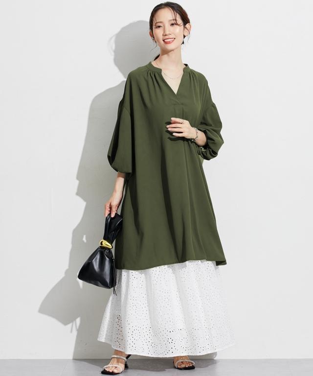 上品見えするのに、ゆるっと楽ちん。体型カバーも叶える優秀チュニックワンピース。 しっかり体型カバーするデザインで、デイリーに活躍するアイテムです。 ●デザイン ・体型カバーを叶えるゆったり設計。ゆるめのシルエットで楽ちんに着こなせる! ・膝丈ラインの丈感で気になるお尻周りはもちろん、太ももなどの脚のラインもしっかりカバー ・ゆるっとしたデザインがすっきり綺麗見えするスキッパーデザイン ・ほんのりパフ袖で大人可愛い印象にを叶えつつ、気になる二の腕も隠れる袖丈 ●素材 キレイなとろみ感があり、上品なブロード素材。 きちんと見えるしっかりとした質感で大人女子に嬉しい1枚です。 ●おすすめのコーディネート 1枚で着るだけでサマになるチュニックですが、ボトムスとのレイヤードスタイルもおすすめです。 細身のパンツやレギンスと合わせて、すっきりとした印象に。 ゆったりとしたワイドパンツやスカートと合わせれば、リラックス感のある大人カジュアルスタイルが完成します。 足元はスニーカーやサンダルでカジュアルに、パンプスやローファーで上品に。 アクセサリーは、華奢なネックレスやピアスをプラスして、女性らしさを演出するのがおすすめです。 シンプルな