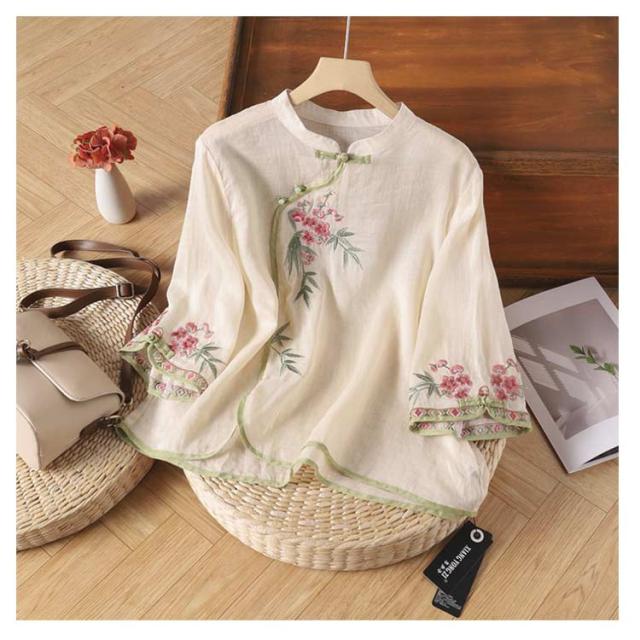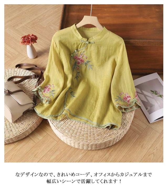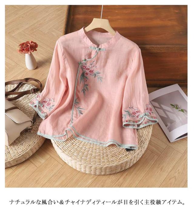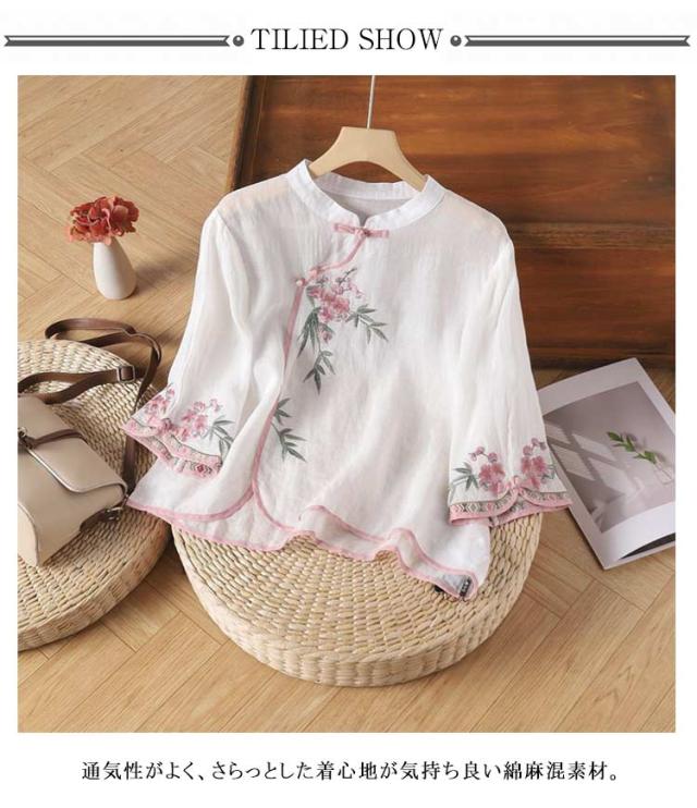 シャツ ブラウス レディース 花柄 綿麻 チャイナ風 トップス ゆったり 夏 薄手 プルオーバー tシャツ カットソー シャツ ブラウス 大きいサイズ 体型カバー カジュアル きれいめ