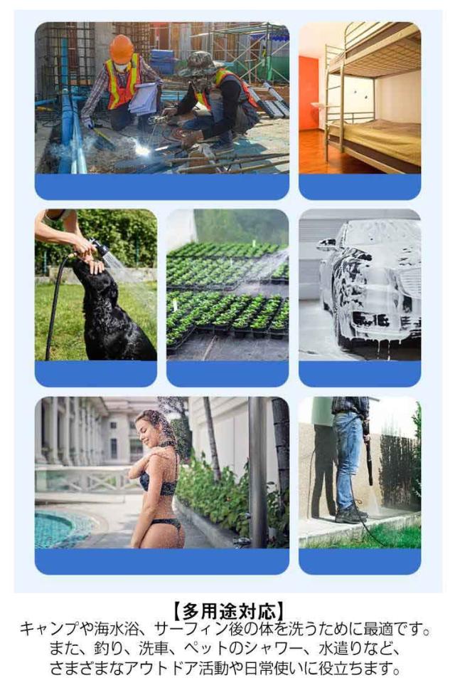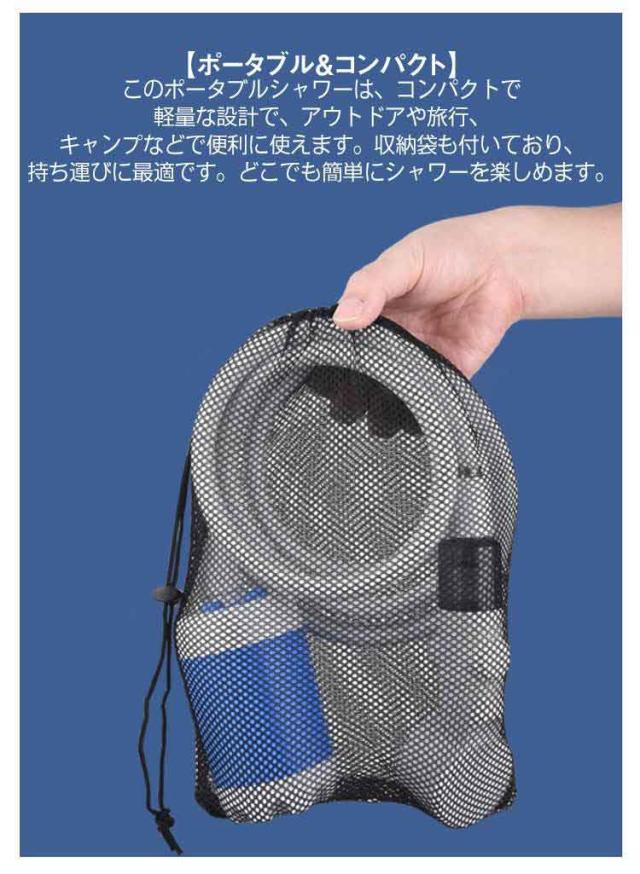 | アウトドアシャワーに最適するポータブルシャワーが登場! 【ポータブル&コンパクト】 このポータブルシャワーは、コンパクトで軽量な設計で、アウトドアや旅行、キャンプなどで便利に使えます。収納袋も付いており、持ち運びに最適です。どこでも簡単にシャワーを楽しめます。 【USB充電式で便利】 4000mAhのバッテリーを搭載しており、USB充電で簡単に充電できます。1回の充電で長時間使用でき、電源を気にせず、どこでもシャワーを楽しめます。 【3段階水流調整】 3段階の水流調整が可能で、シャワーの強さを自分の好みに合わせて調整できます。水流量最大は5L/minで、十分な水圧を保ちながら、快適なシャワータイムを提供します。 【多用途対応】 キャンプや海水浴、サーフィン後の体を洗うために最適です。また、釣り、洗車、ペットのシャワー、水遣りなど、さまざまなアウトドア活動や日常使いに役立ちます。 【防水設計&軽量】 完全防水設計で、屋外でも安心して使用できます。軽量で持ち運びが簡単なので、長時間使用しても疲れにくいです。 | |