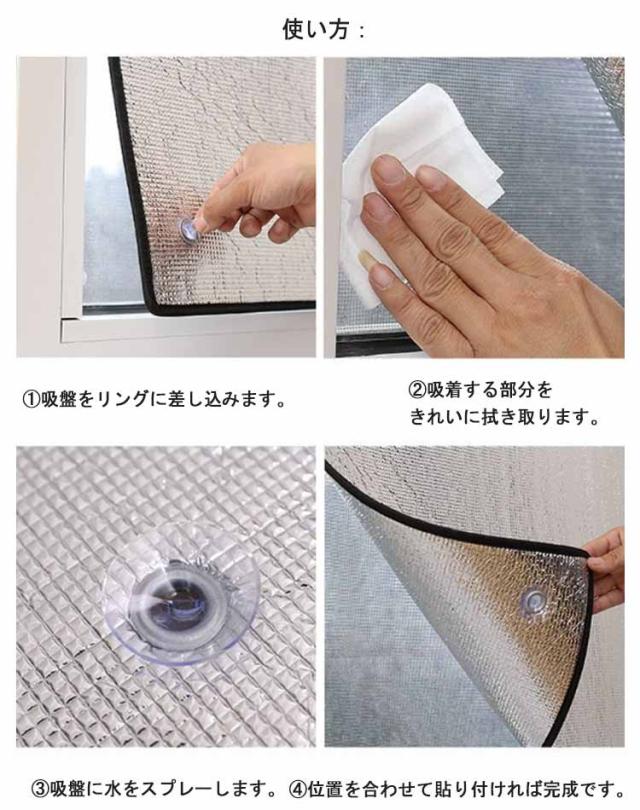 | エアコンの効率を高めて夏は涼しく冬は暖かい、断熱シートのアルミタイプ。 アルミの反射効果で通常の断熱シートに比べ遮熱・断熱性能がアップ。 UVを99%カットし、カーテンや家具の色あせを防ぎます。 遮熱効果、電気代の節約にもおすすめです。 吸盤で簡単取り付け、粘着剤を使用しておらず剥がす際にもキレイに剥がせます。 使い方: 1.吸盤をリングに差し込みます。 2.吸着する部分をきれいに拭き取ります。 3.吸盤に水をスプレーします。 4.位置を合わせて貼り付ければ完成です。 | |
