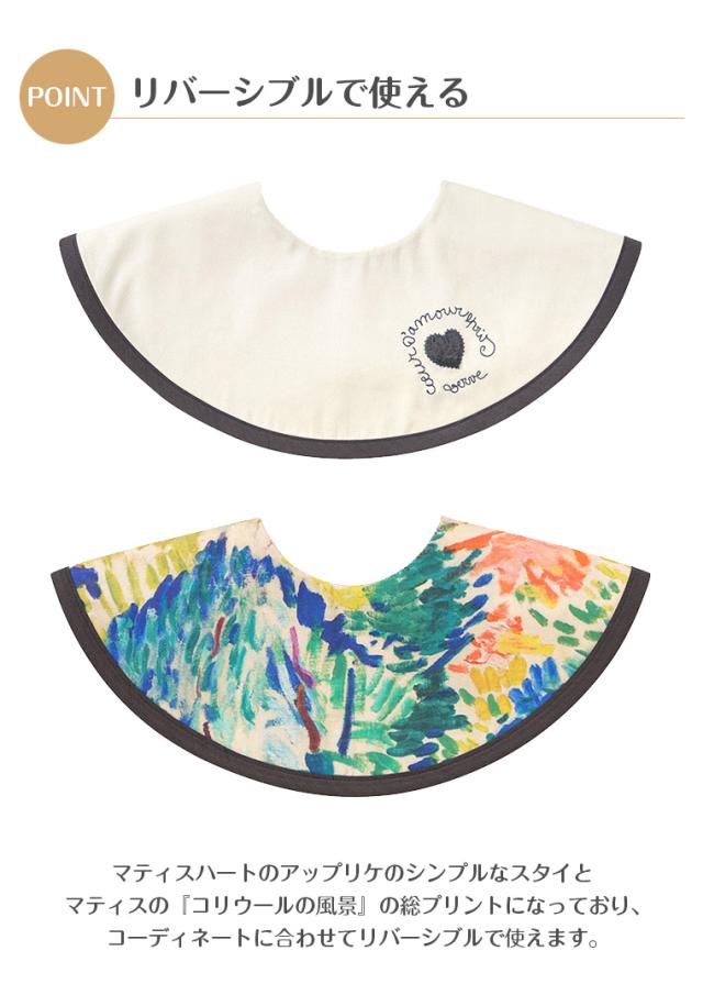 裏返すとマティスの『コリウールの風景』の総プリントになっており、コーディネートに合わせてリバーシブルで使えます。男女問わず使用していただけるデザインです。贈り物にもぴったりのアイテムです。