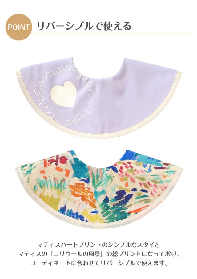 マティスのハートの作品が大きくプリントされておりインパクトのあるデザインです。裏返すとマティスの『コリウールの風景』の総プリントになっており、コーディネートに合わせてリバーシブルで使えます。男女問わず使用していただけるデザインです。贈り物にもぴったりのアイテムです。