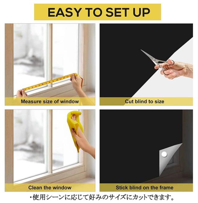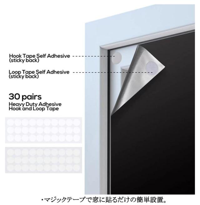 | サイズについての説明 | セット内容物:遮光シート、収納袋、マジックテープ10ペア、両面テープ、メージャー、小型カッター ※サイズ表の実寸法は商品によって1-3cm程度の誤差がある場合がございます。 【取り付け方法】 1.窓のサイズを測る 2.窓のサイズに合わせて遮光シートをカットします(1cm程度を残します) 3.窓枠のサイズに合わせてマジックテープを貼ります。 4.窓枠に貼るマジックテープをきれいにし、10秒くらい押します。 ・【こんなお部屋におすすめ】朝日や西日がよくあたるお部屋、寝室 ・【こんな方におすすめ】光を遮り朝までぐっすり眠りたい方、1級遮光カーテンへの買い替えをお悩みの方 |
