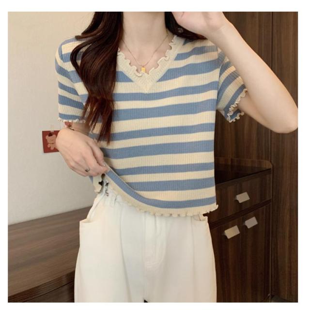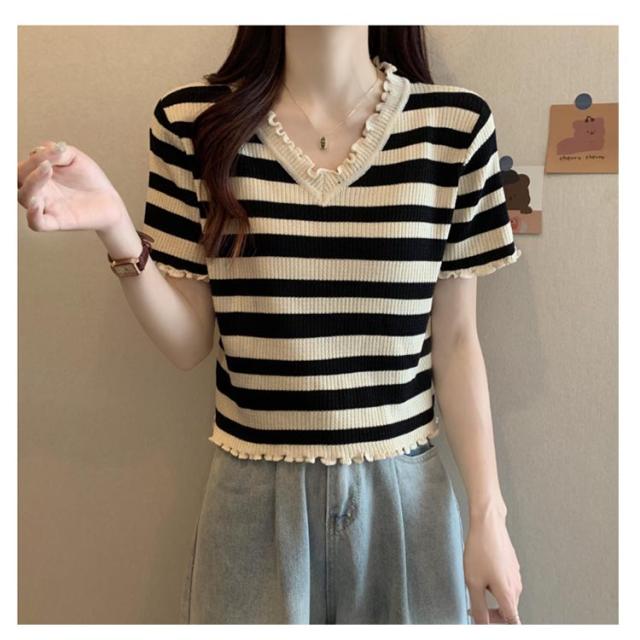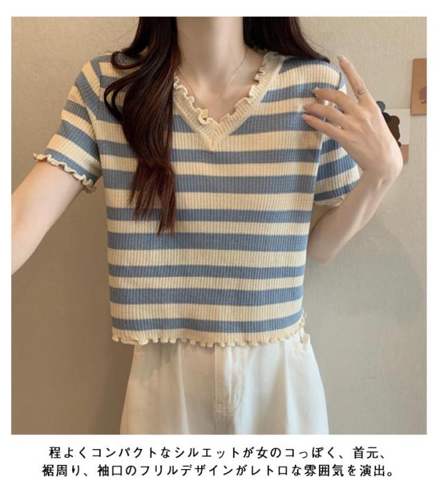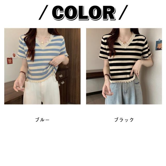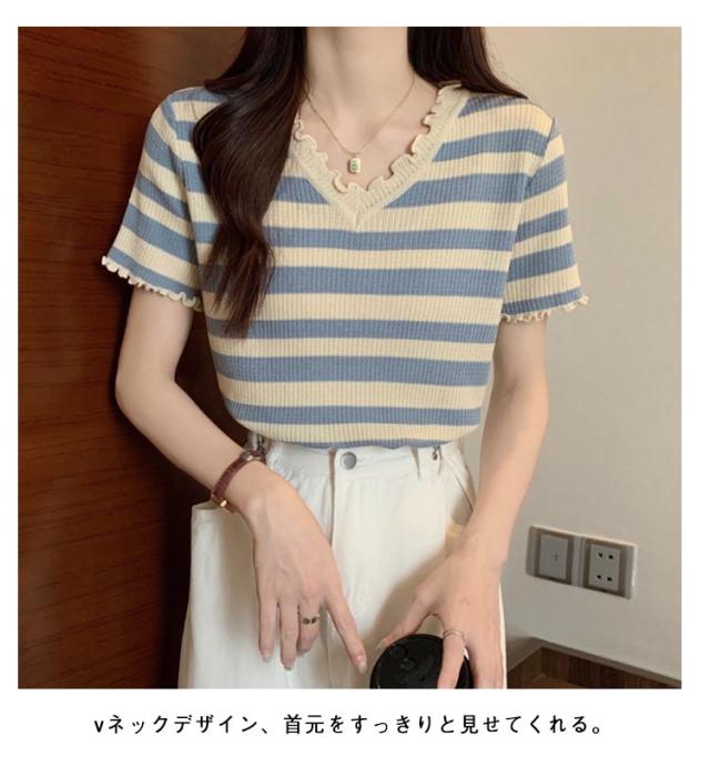 かわいい 半袖ニットソー ボーダー柄 Vネック サマーニット レディース ショート丈 春夏 ストライプ 夏トップス フリル トップス 可愛い 夏服 大きいサイズ ボーダー柄サマーニット ニットトップス キレイめ 着?せ サマーニット 夏Tシャツ 可愛い お洒落