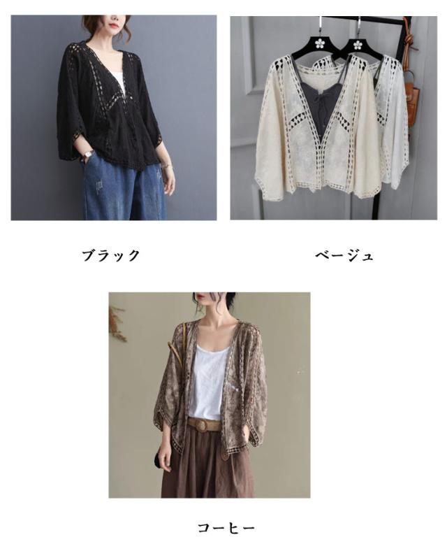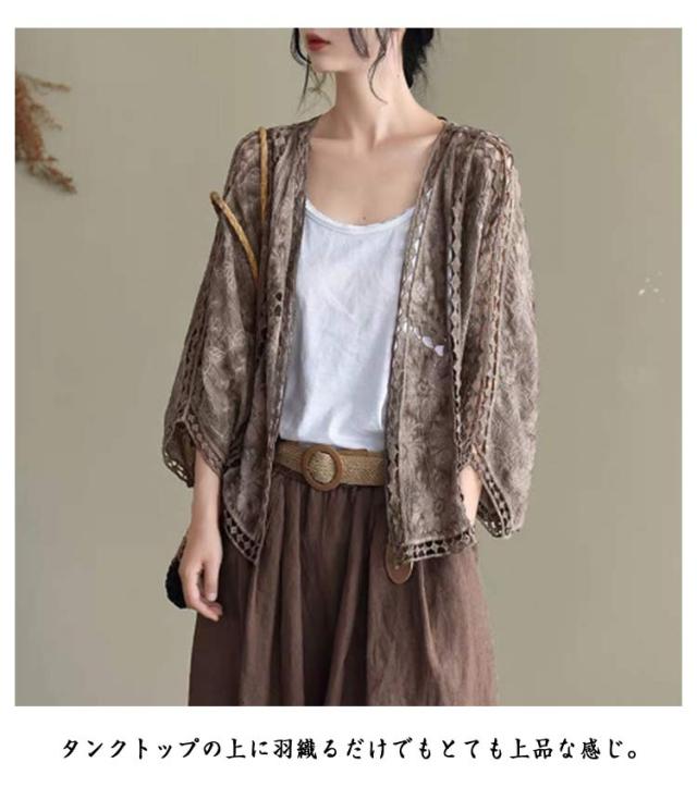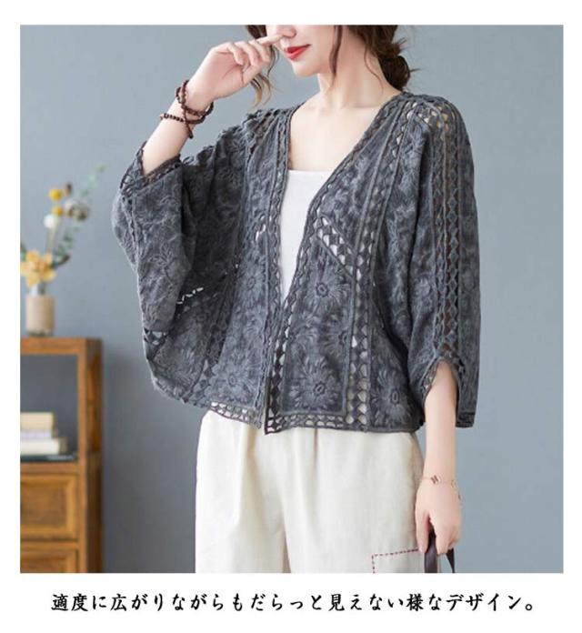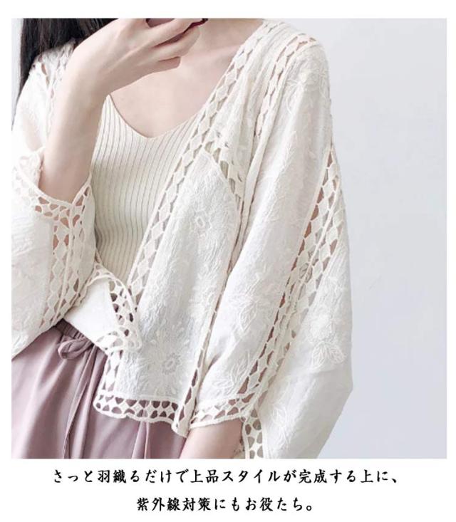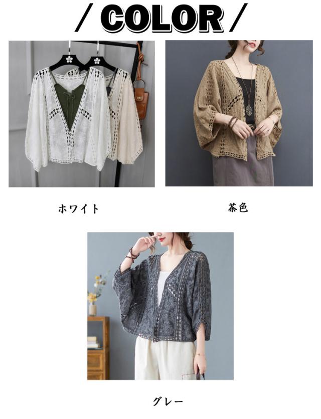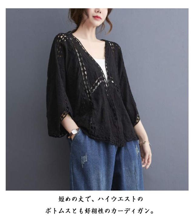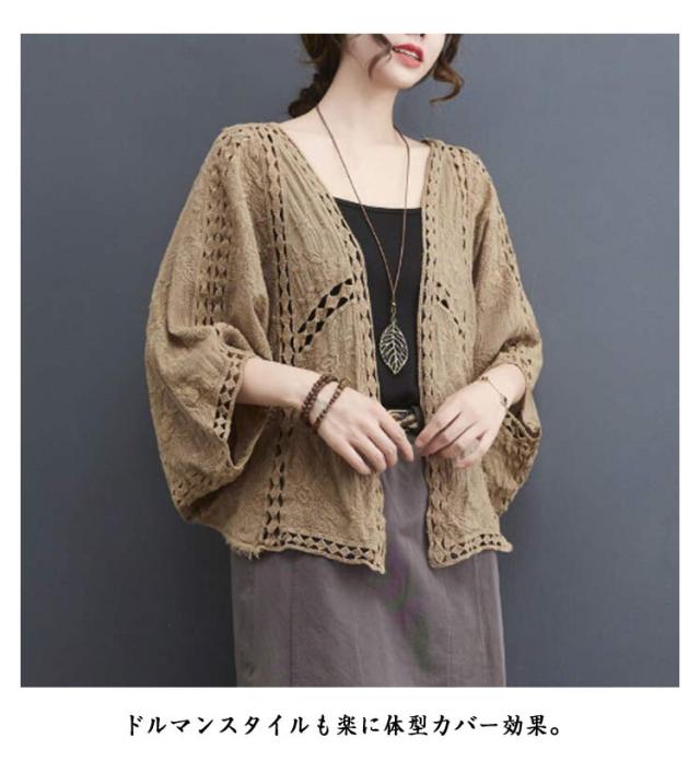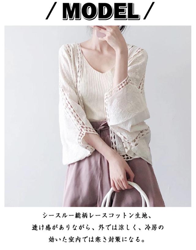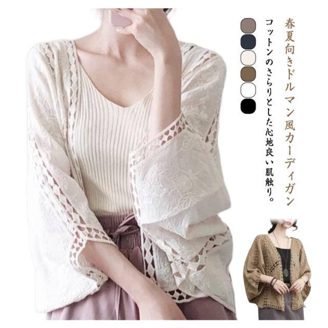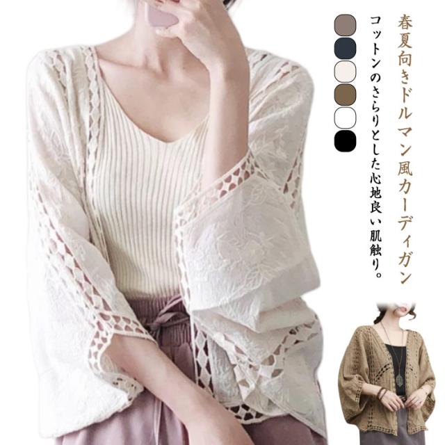レディース ドルマン ボリューム袖 夏 透ける ゆったり 綿 透かし編み コットン 体型カバー ボレロ サマーカーディガン レースカーディガン トップス 羽織り カーディガン カジュアル 春夏 レース ショート丈 7分袖 UVカット