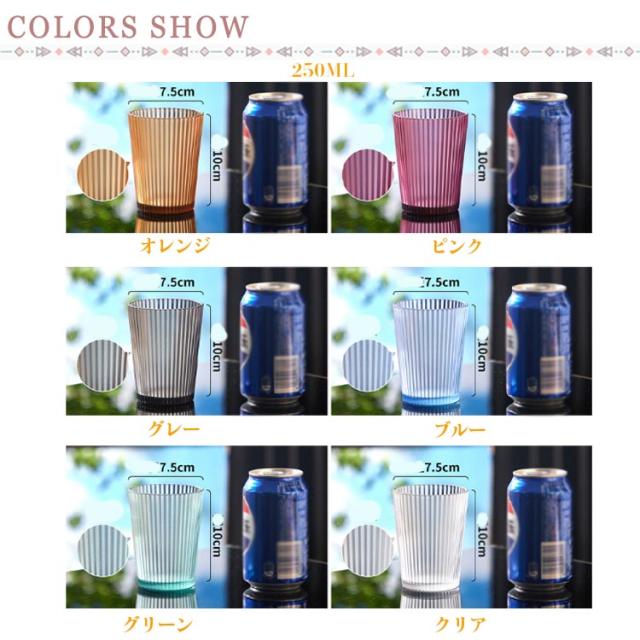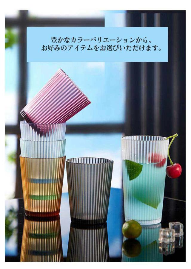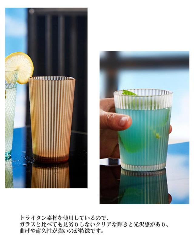 | おしゃれなストライプ模様の割れないコップ。【4個セット】【250cc?400cc】2サイズ 豊かなカラーバリエーションから、お好みのアイテムをお選びいただけます。 トライタン素材を使用しているので、ガラスと比べても見劣りしないクリアな輝きと光沢感があり、曲げや耐久性が強いのが特徴です。 落としても割れにくく、BPAフリーなのでお年寄りや子供にもおすすめ。 アウトドアや日常使いに最適な長く愛用できるコップとして、デザイン性と機能性を両立しています。 収納時は重ねてスタッキング可能です | |