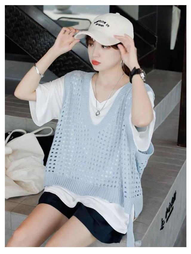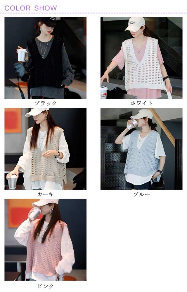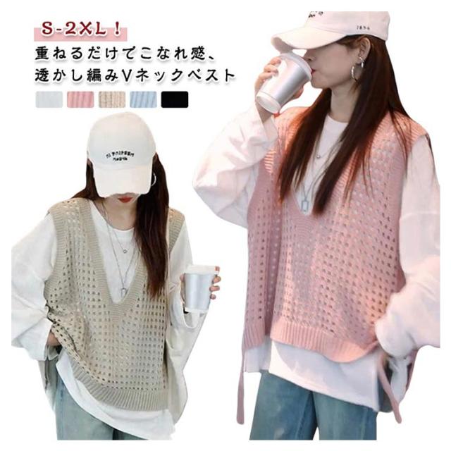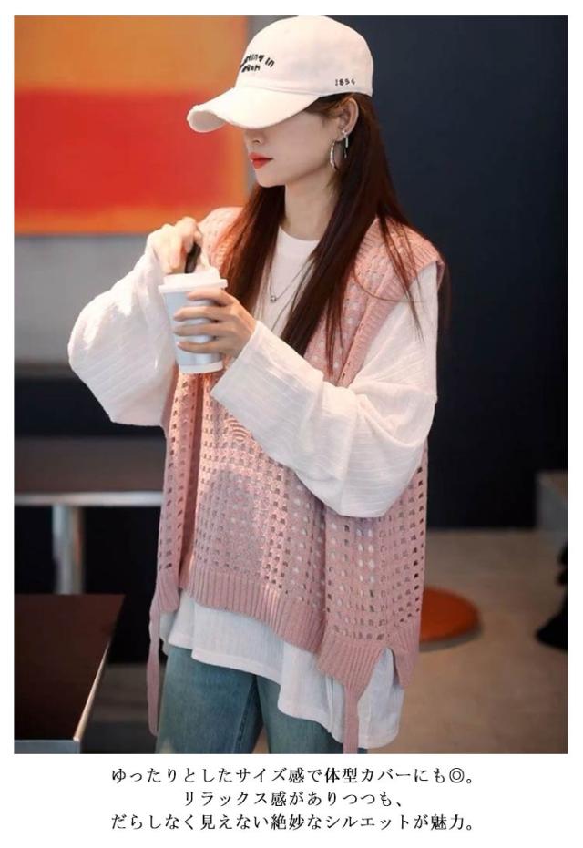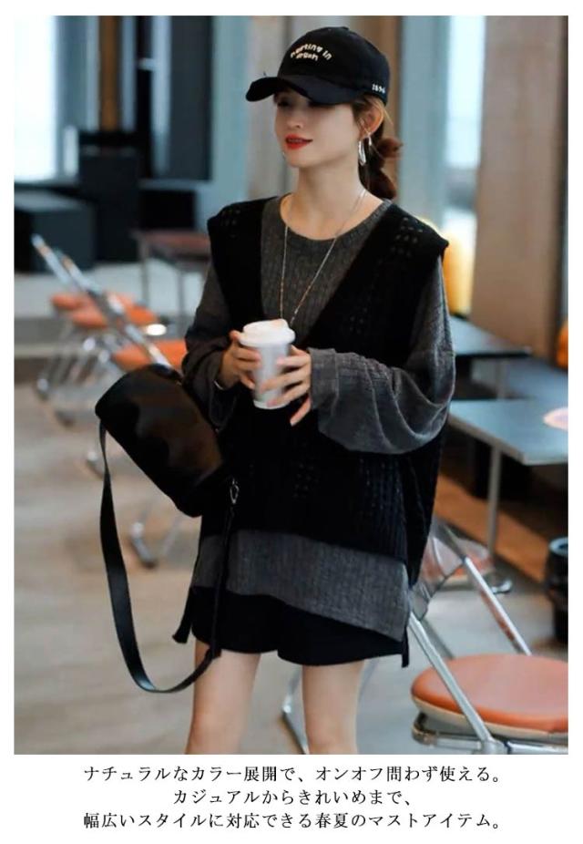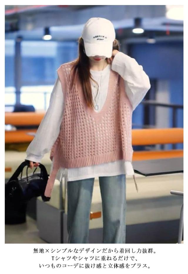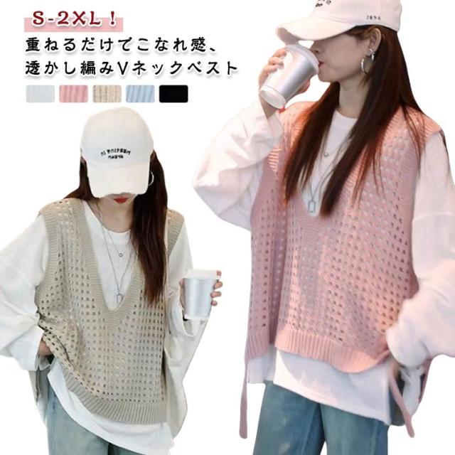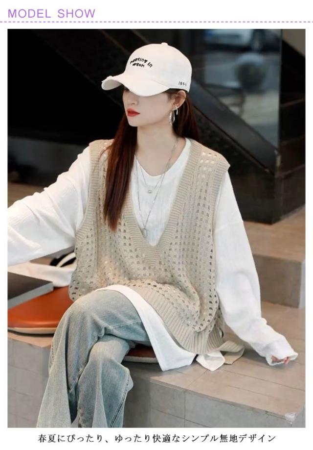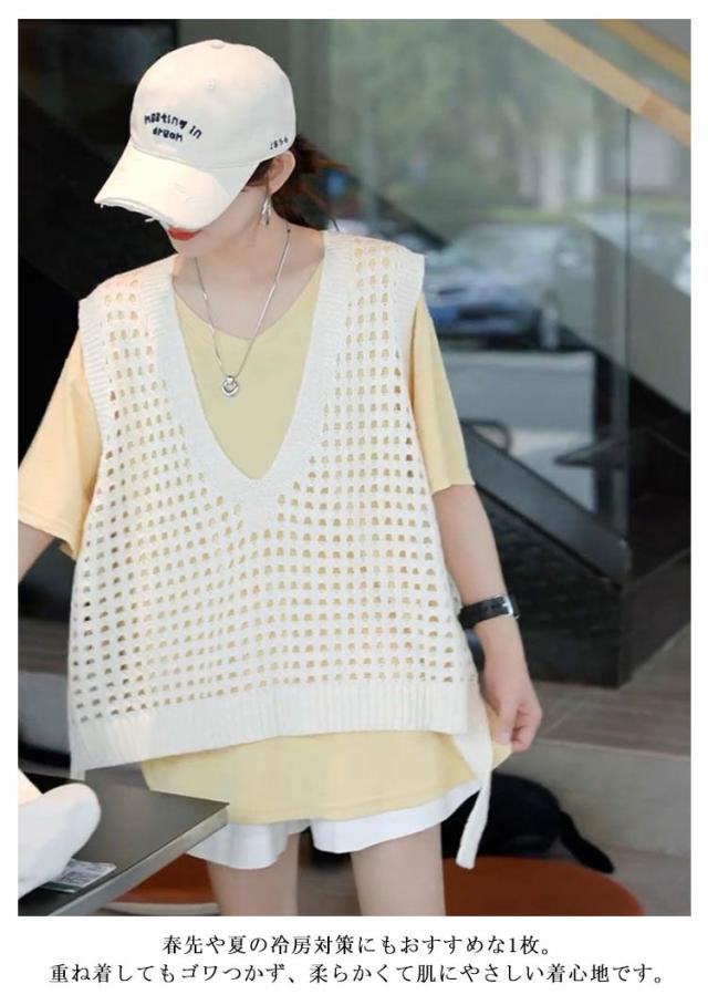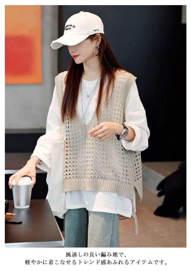 重ね着 ニットベスト Vネック ノースリーブ 透かし編み 無地 シンプル 春夏 プルオーバー レディース ゆったり 可愛い ニットベスト オーバーサイズ レイヤード 薄手 体型カバー トップス ナチュラル Tシャツ合わせ