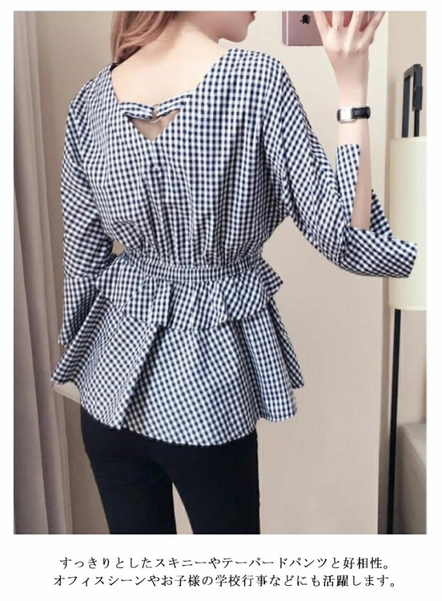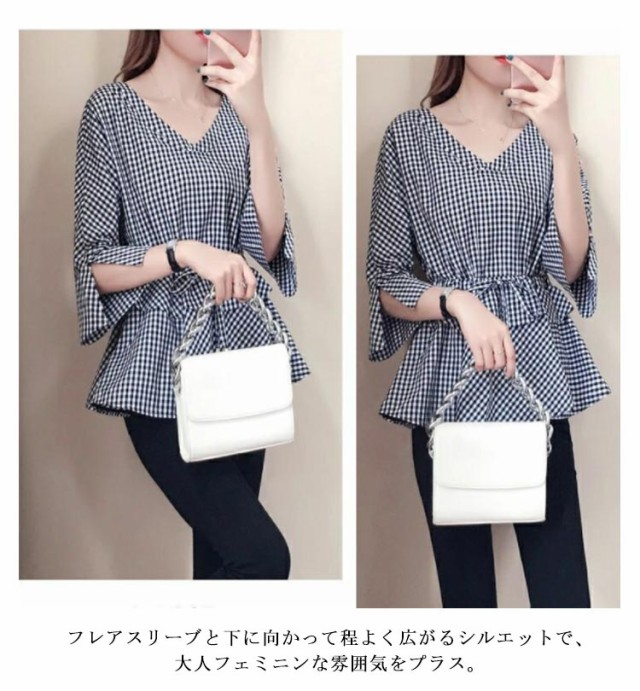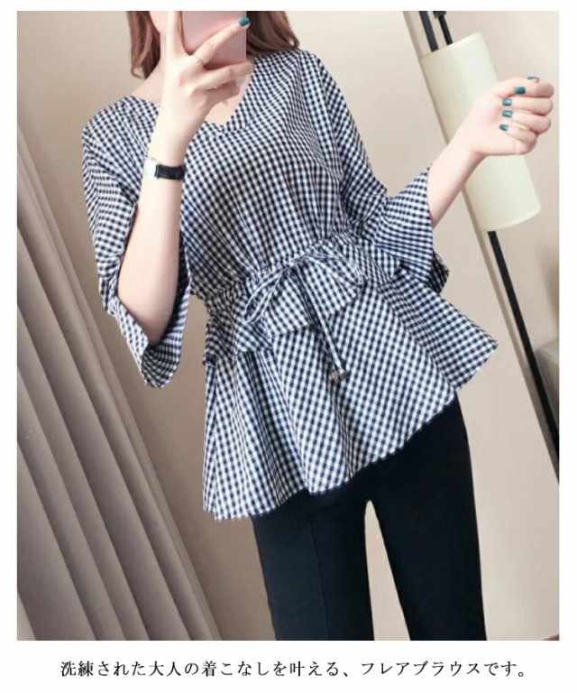フレアチュニック ペプラム フレンチスリーブ ティアードチュニック フリル ギャザー ティアード ペプラムブラウス フレア ブラウス ティアードチュニック ブラウス 五分袖 Vネック チェック柄 春 夏 薄手 体型カバー