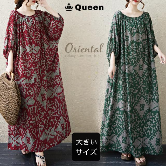 ★☆ワンピース 大きいサイズ スモックワンピース オリエンタル柄 五分袖 ワイドスリーブ ゆったり 体型カバー LL 3L 4L 5L 6L ロング丈 フレア 着痩せ ナチュラル カジュアル☆★