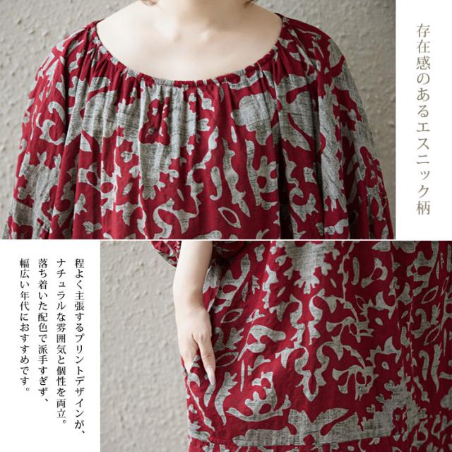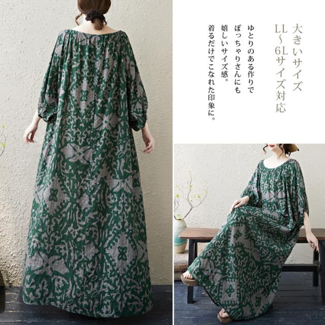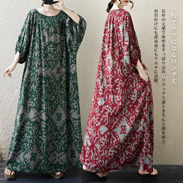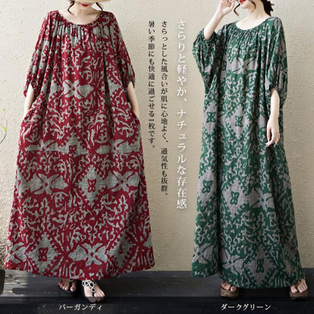 ワンピース スモックワンピ オリエンタル柄 五分袖 ゆったり ロング丈 大きいサイズ (381032)