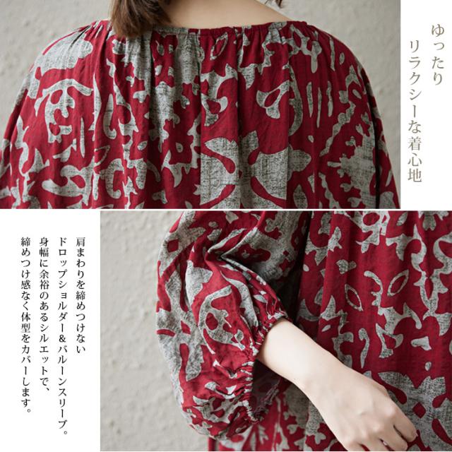 ゆるやかなワイドスリーブとオリエンタル柄が魅力。体型カバーも叶うスモックワンピース。