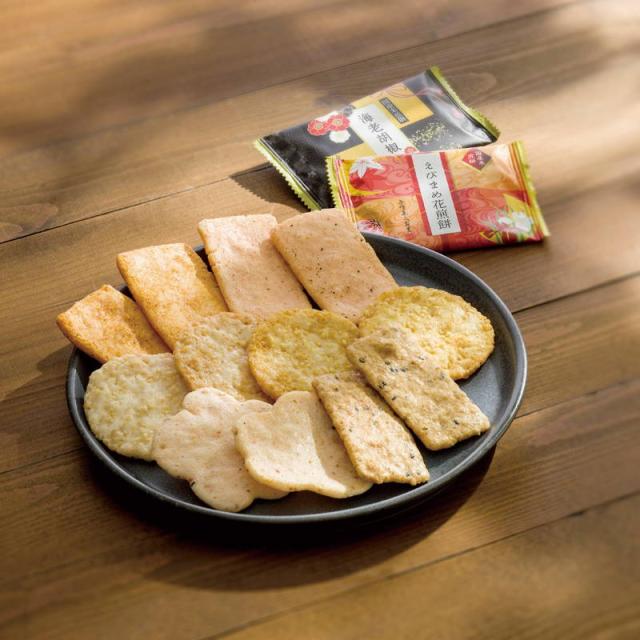 内容:海老カレー煎餅・黒ごま入り玄米煎餅各14枚・えびまめ花煎餅10枚・海老胡椒煎餅9枚・つぶやきサラダ煎餅・金澤カレー煎餅各5枚