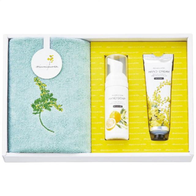 春を告げる花ミモザをモチーフとした今治タオルと、天然香料ミモザ精油とグレープフルーツの香りが爽やかな、アミノ酸系洗浄成分配合のクリーミィーな泡で手肌をやさしく洗い上げるハンドソープと、天然香料ミモザ精油がふんわりと柔らかく香る、するすると伸びる滑らかな使い心地のハンドクリームのセットです。