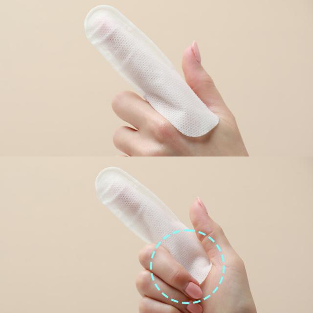 1:指型シートを清潔な手で1枚取り出して、両面が2層ずつになるよう中央に人差し指を入れてください。