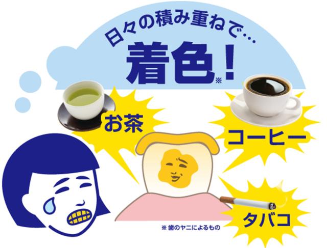 歯の黄ばみ*1の主な原因は、お茶やコーヒーに含まれる色素や、タバコのヤニなどが歯の表面に付着することです。これらの成分は、歯の表面にあるタンパク質と結びついて着色を引き起こします。