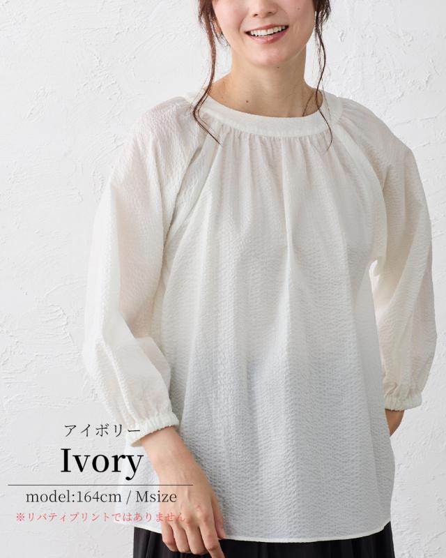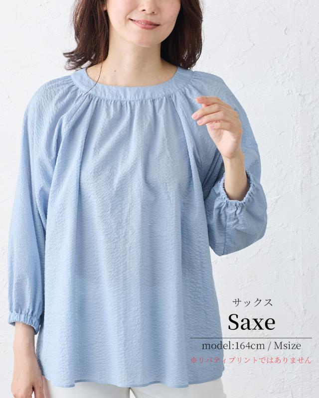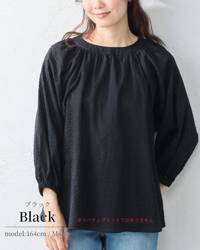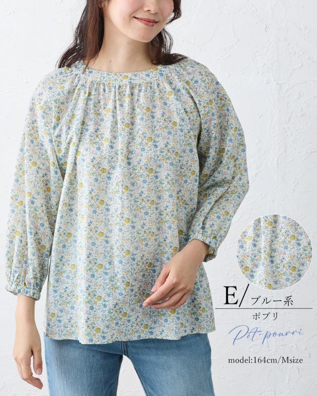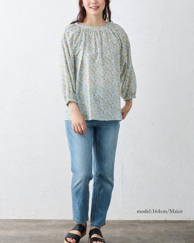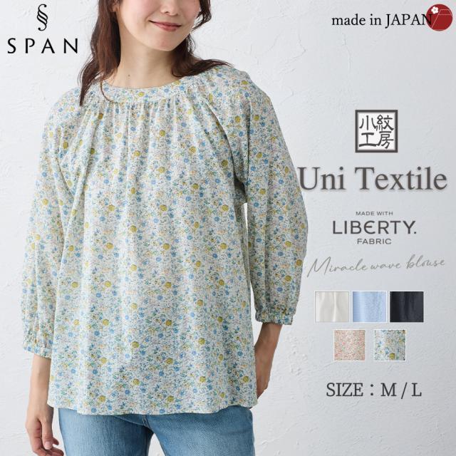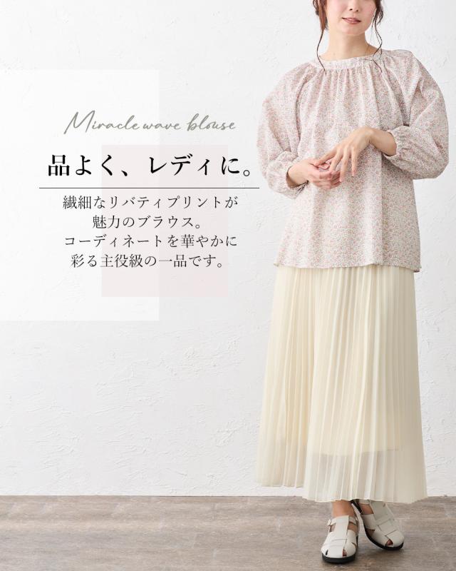 【日本製】リバティ LIBERTY ミラクルウェーブ ブラウス 7分袖 花柄 綿100% コットン 綿 クルーネック ファッション レディース 女性 春 夏 ギャザー ボタン 30代 40代 50代 60代 カジュアル ふんわり エレガント フェミニン