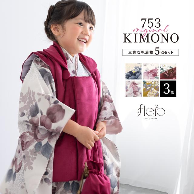 七五三 着物 被布コート セット 3歳 女の子 floro 2025新作 レトロ 和モダン 紺 黒 白 赤 紫 黄 ピンク マゼンタ 菊 梅 花柄 かわいい 女児 3才用 販売 購入 送料無料