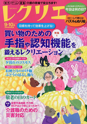 高齢者介護施設で働く介護職のためのレクリエーション情報誌。大人気の壁面や季節の制作、ゲームレクなど、介護の現場で求められるレクのアイデアに、音楽、料理、認知症ケアなど幅広い分野を網羅。ぬり絵やまちがいさがしなどのパズルも充実。今号の壁面は、夕暮れに揺れるコスモスをテーマに季節感あふれる壁面をご紹介します。季節の制作はお月見やハロウィンの行事制作とぶどうの吊るし飾り。読み物特集は、2024年元日に起こった能登半島地震で、BCPがどう役立ったかを検証する「介護職のための災害対策」です。