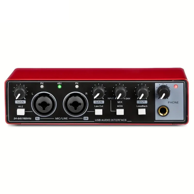 ギターやベースへのアクセスをサポートし、歪みや過負荷を心配することなく録音でき、48Vファンタム電源ボタンも装備されています。 両方のマイクプリアンプには、別々のボリュームコントロールノブ、信号インジケーター、過負荷インジケーター、クイックフェードボタンがあります。