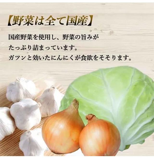 ○原材料名:野菜(キャベツ(国産)、玉ねぎ(国産)、にら(国産))、豚肉(鹿児島県産)、豚脂肪(鹿児島県産)、粒状大豆たん白、粉末状大豆たん白、香辛料、植物油、食塩、おろしにんにく(国産)、砂糖、乳糖、たん白加水分解物、酵母エキス、皮(小麦粉、植物油、粉末状小麦たん白、食塩)/加工でん粉、調味料(アミノ酸等)、(一部に小麦・乳成分・ごま・大豆・豚肉を含む)