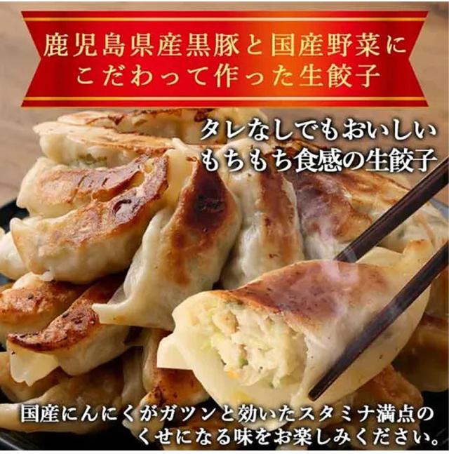 鹿児島県産黒豚と国産野菜をたっぷり使った生ぎょうざです。キャベツや玉ねぎ、にらなどの新鮮な国産野菜の甘みと、ジューシーな黒豚の旨みが絶妙に調和。さらに国産にんにくのパンチが効いており、食欲をかき立てます。しょうがのさっぱりとした風味もアクセントとなり、タレなしでも美味しくお召し上がりいただけます。焼き餃子はもちろん、揚げ餃子にしてお弁当にもぴったりの一品です。