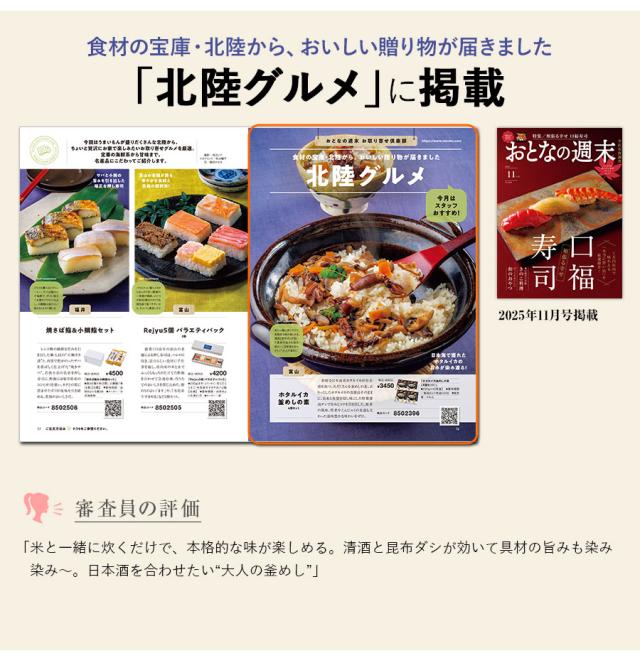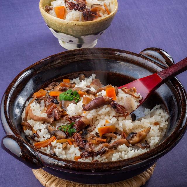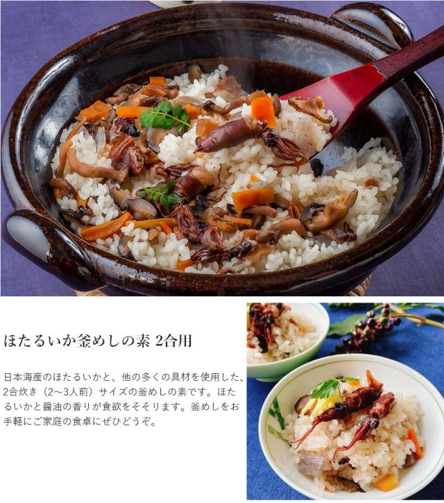 新鮮な日本海産ホタルイカが存在感を放つ、具だくさんな釜めしの素。ぷりっとしたホタルイカの食感はそのままに、昆布と魚醤を隠し味にした特製醤油ダシで旨みとコクを引き出した。椎茸の風味、野菜やこんにゃくの食感も交わった滋味豊かな味わいをぜひ。