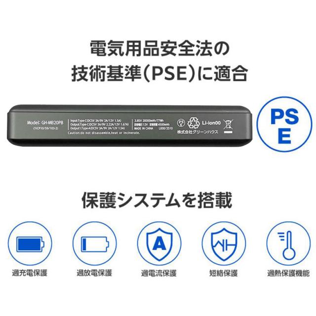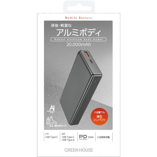 モバイルバッテリー 20000mAh 急速充電 PD20W 薄型 コンパクト USB タイプC 2台同時充電 残量表示 PSE認証 iPhone GH-MB20PB-SV グリーンハウス
