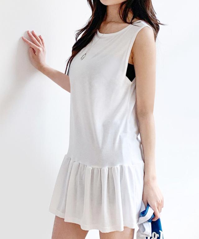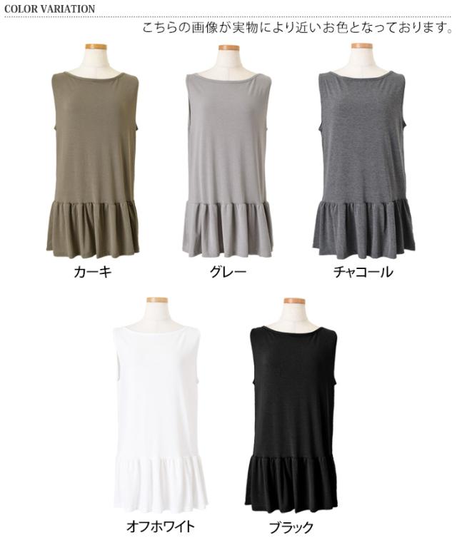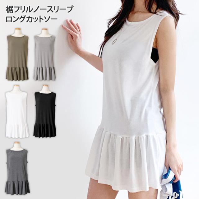 新作 裾フリルノースリーブシンプルロングカットソー レディース きれいめ トップス タンクトップ 薄手 夏 秋 ゆったり 裾フレア ペプラム 涼しい カジュアル 可愛い 無地 ワイド 重ね着 レイヤード デイリー
