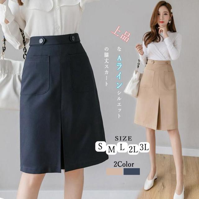 スカート Aライン ハイウエスト ポケット付き ひざ丈 ミディアム 膝丈 ロング丈 美脚 オフィス OL 二次会 デート オフィス フォマール カジュアル ボトムス S M L 2L 3L