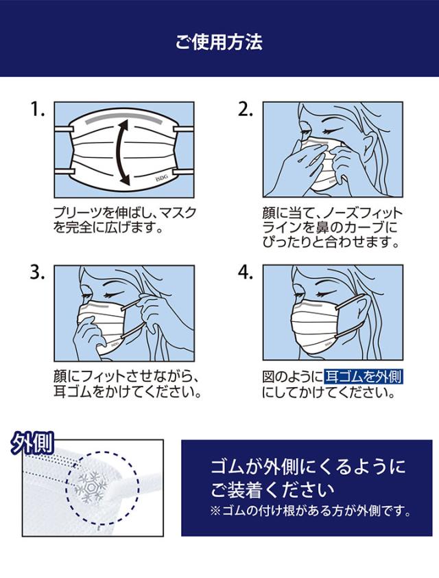| ご使用方法 | ・プリーツを伸ばし、マスクを完全に広げます。 ・顔に当て、ノーズフィットラインを鼻のカーブにぴったりと合わせます。(ひもの接着面が外側) ・顔にフィットさせながら、耳にひもをかけてください。 |