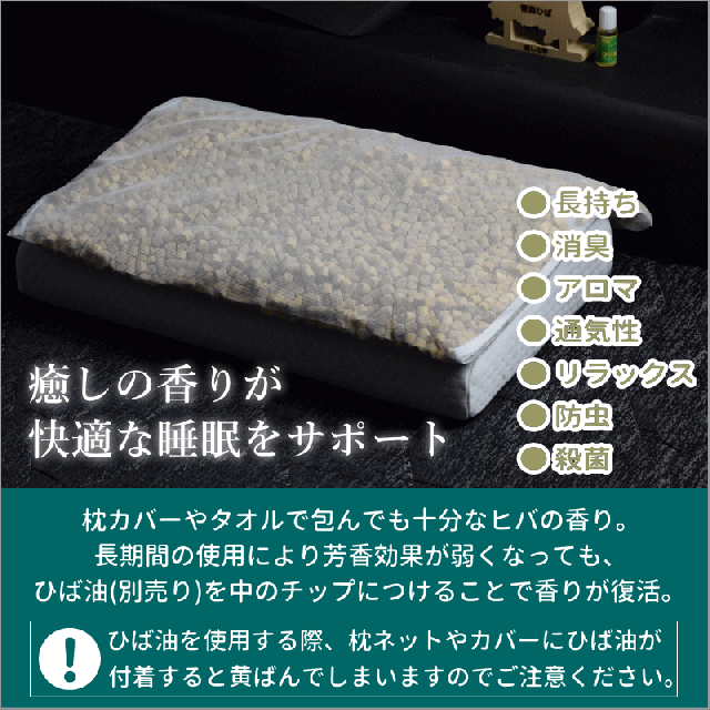 | 主なご特徴と利用法 | 枕としてご利用 型崩れせず長持ち 消臭 殺菌 抗菌 防虫 精神安定、アロマ効果(癒し効果) |