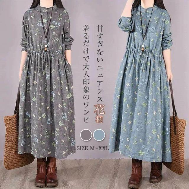花柄 ワンピース 長袖 シャツワンピース ロング 可愛い 花柄ワンピース レディース ロングワンピース 大きいサイズ 花柄 ワンピ ロングワンピ ギャザー 総柄 ロング 春 冬 秋 ウエストひも付き 美脚 通勤 春 着痩せ ハイウエスト 50代 30代 40代 新作 定番 送
