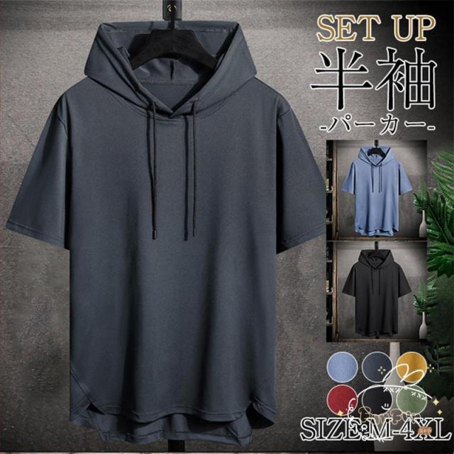 夏パーカー 半袖 Tシャツ メンズ 夏パーカー 夏用 フード付き 薄手 カジュアル レイヤード プルオーバー スウェット かっこいい ゆったり