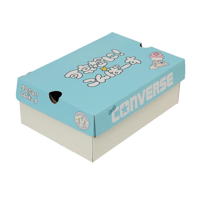 描きおろしのロゴを使用したインソール、キャラクターとオールスターが組み合わさった描きおろしのイラストが入ったオリジナルカートンを採用。