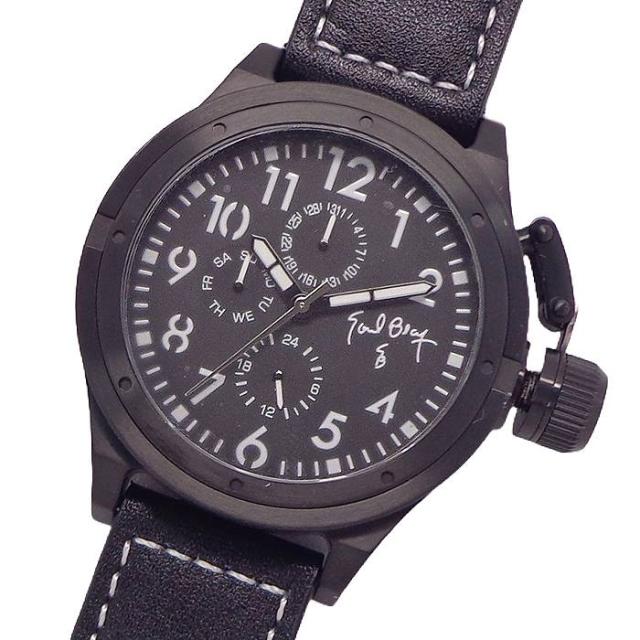 ブラックカラーでグッと決まるウォッチです。 多機能マルチファンクション機能、24時間、日付、曜日も表示の腕時計です。 リューズカバー・本革ベルトと、この機能でコスパ大です。 |