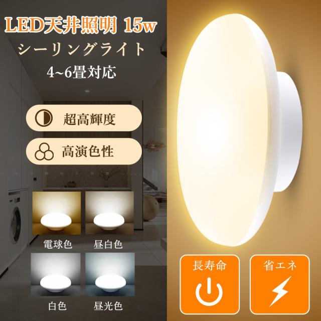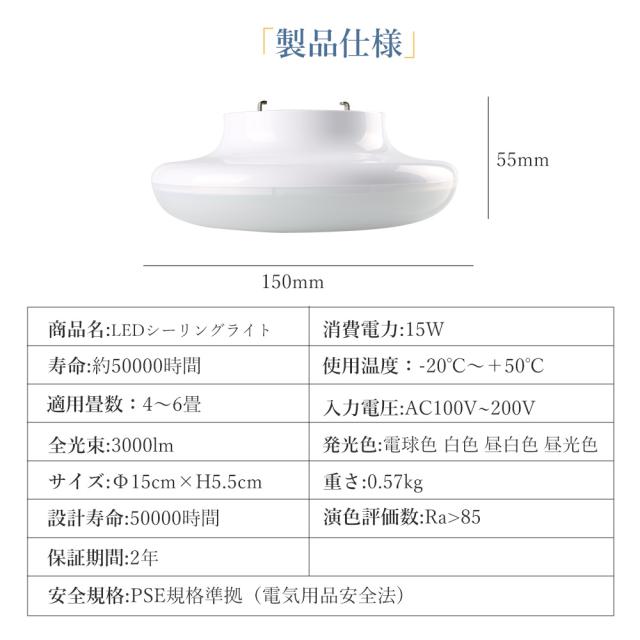 薄型で直径15cm、高さ5.5cmの軽量コンパクト設計。電球色から昼光色まで4色の光色が選べ、高演色Ra85で自然な色合いを再現します。消費電力15Wで3000lmの明るさを実現し、省エネ性能も抜群。超寿命5万時間で交換不要。工事不要で簡単取付、虫やホコリが入りにくい密閉構造。安心の2年保証&PSE認証取得済みで、長く快適にご使用いただけます。