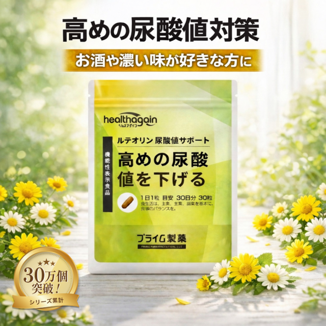 尿酸値 を 下げる サプリ ルテオリン 高めの 尿酸 ダウン サポート 尿酸塩 血液 中 プリン体 プライム製薬 機能性表示食品 送料無料 30日分 サプリメント