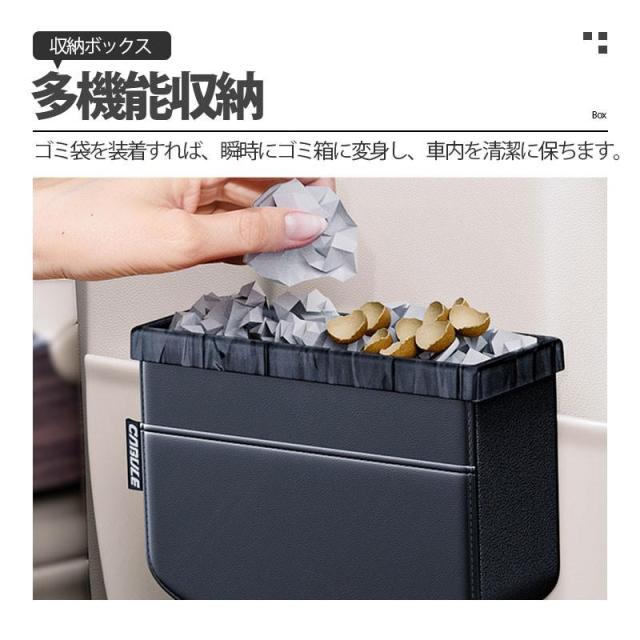 スマホ、財布、メガネ、タバコ、駐車券など、様々な小物をすっきり収納可能。ゴミ袋を装着すれば、瞬時にゴミ箱に変身し、車内を清潔に保ちます。