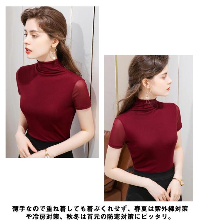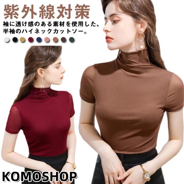ハイネック カットソー レディース 半袖 タートルネック ボトルネック tシャツ ストレッチ 薄手 インナー トップス レイヤード 重ね着 伸縮性 袖 透け 首元保護 UV対策 日よけ防止 冷房対策 大きいサイズ おしゃれ 無地 シンプル きれいめ 送料無料