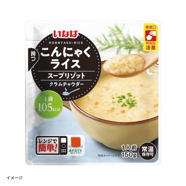 | 原材料名: こんにゃく加工品(こんにゃく、大豆)(国内製造)、野菜(たまねぎ、じゃがいも、にんじん)、牛乳、あさり、小麦粉、植物油脂、全粉乳、砂糖、チキンエキス、食塩、あさりエキス、チキンコンソメパウダー、白菜エキスパウダー、香辛料/増粘剤(加工でん粉、キサンタンガム)、加工でん粉、調味料(アミノ酸等)、乳化剤、水酸化カルシウム(こんにゃく用凝固剤)、(一部に小麦・乳成分・ゼラチン・大豆・鶏肉を含む) ※本製品に使用しているあさりにはかにが共生しています。