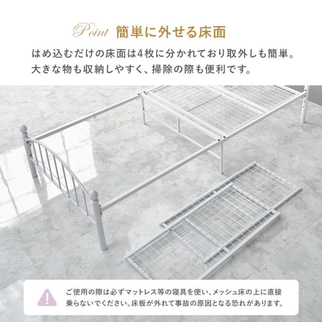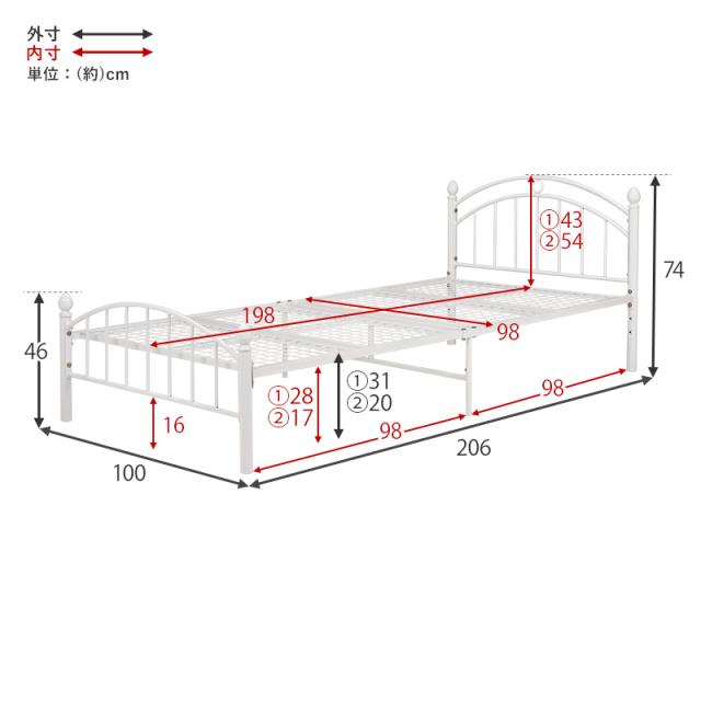 さりげない装飾をあしらったエレガントなパイプベッド。床面高さは2段階に調節可能 ●上品でフェミニンなベッドフレーム。 さりげない装飾をあしらったデザインでエレガントな空間を演出 ●高さを2段階に調整 低い:ベッド下:17cm、床面高20cm 高い:ベッド下:28cm、床面高31cm ●通気性の良いメッシュ床 床板はメッシュになっているので湿気がこもりにくく、年中快適にご使用できます。 ●簡単に外せる床面 はめ込むだけの床面は4枚に分かれており取外しも簡単。 ●耐荷重、約90Kg お子様から大人まで安心してご使用できます。 生産地:中国製 サイズ:(約)幅100×奥行206×高さ74×床面高31/20cm 素材:主材 スチール 内寸及び補足説明:■組立式 ■床面サイズ:W98×L198cm ※お客様組立て品につきましては、組み立て後に不良の連絡をされても対応ができません。組み立て前にパーツに不良・傷等がないか、必ずご確認下さいますようよろしくお願い申し上げます。 ※記載は商品仕様の一部です。仕様説明不足等の理由での返品はできません。特に適合等は必ずご確認ください。